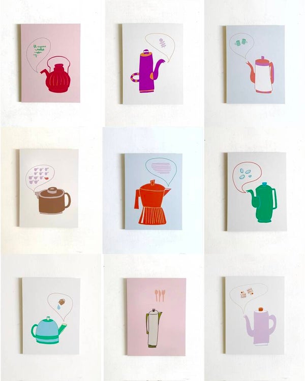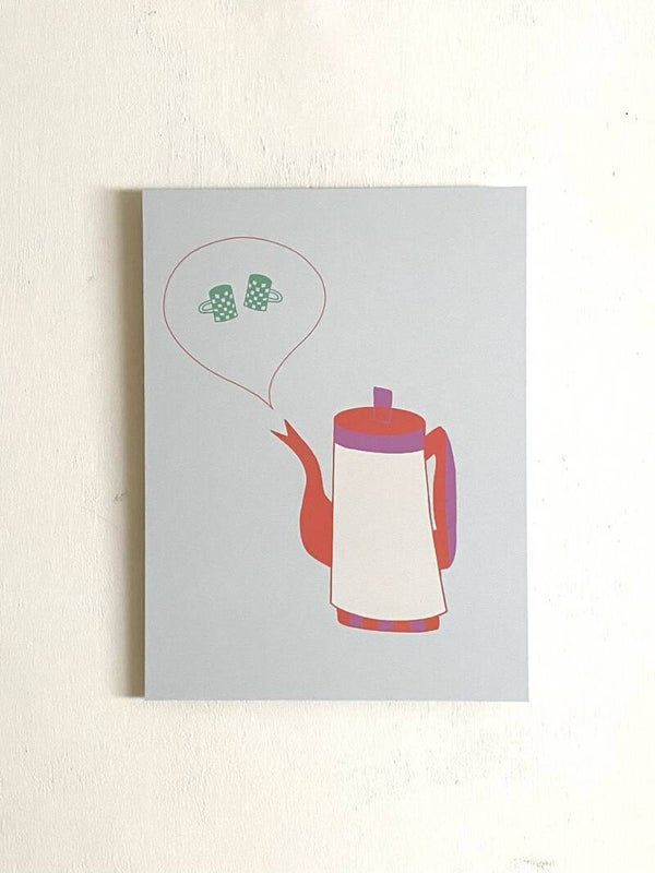 Mijn koffiepotillustraties beginnen met verf op papier – intuïtief, met de hand getekend. Daarna krijgen ze digitaal hun eigen karakter. Door de afdruk op aluminium komt elk detail tot leven en ontstaat een verrassend samenspel van vorm, kleur en een verhaal.